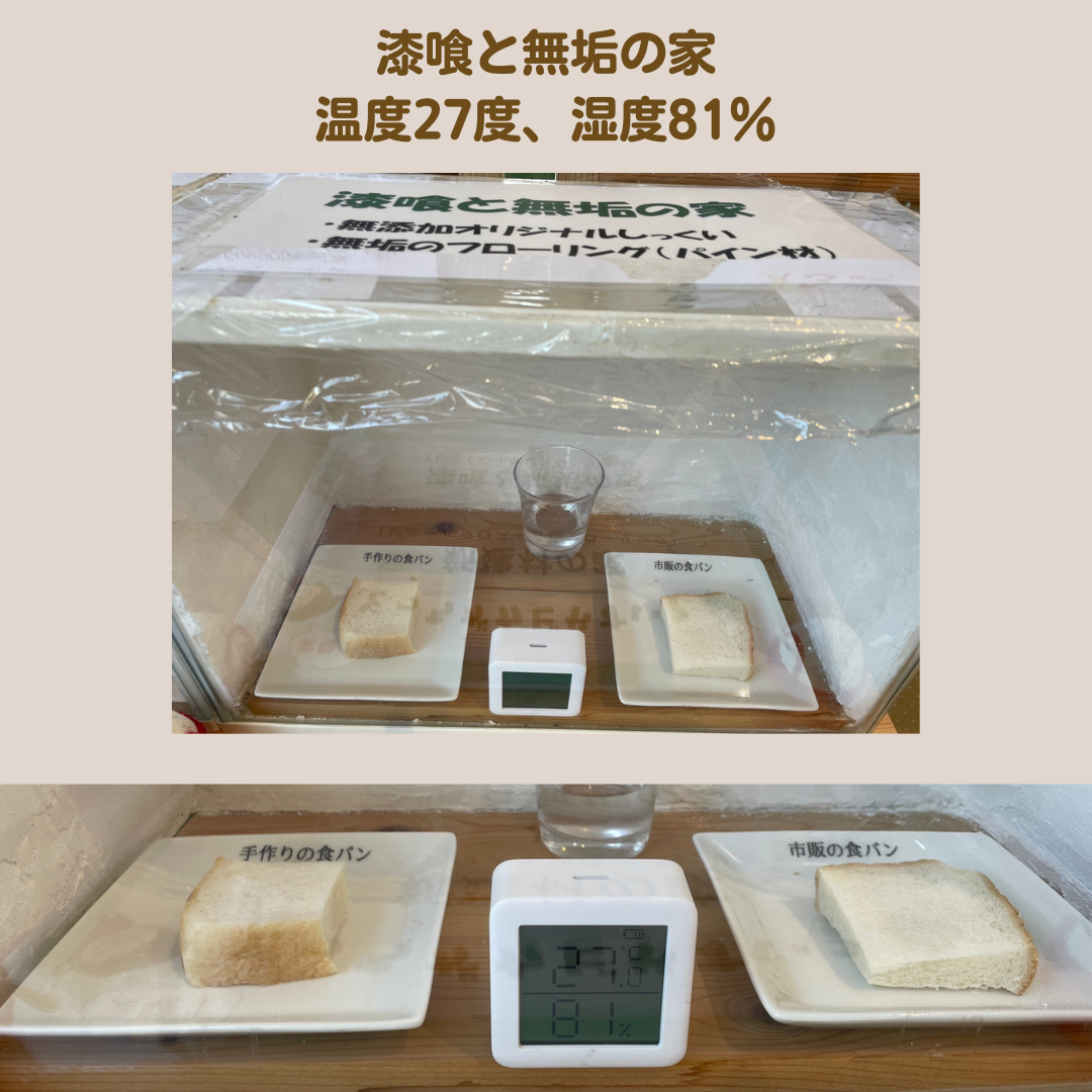 「新建材の家」の「手作りパン」からカビが発生し、「市販のパンに」派生。「漆喰と無垢の家」にはカビは見当たりません。