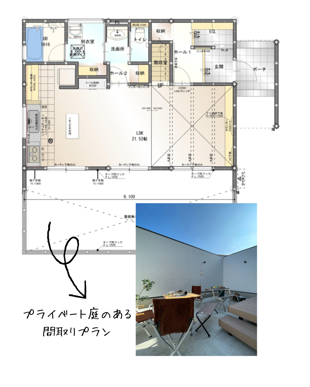 ポイント:アウトドア派には土間収納やガレージ併設。リビングを囲む壁を建ててプライベート庭も人気。