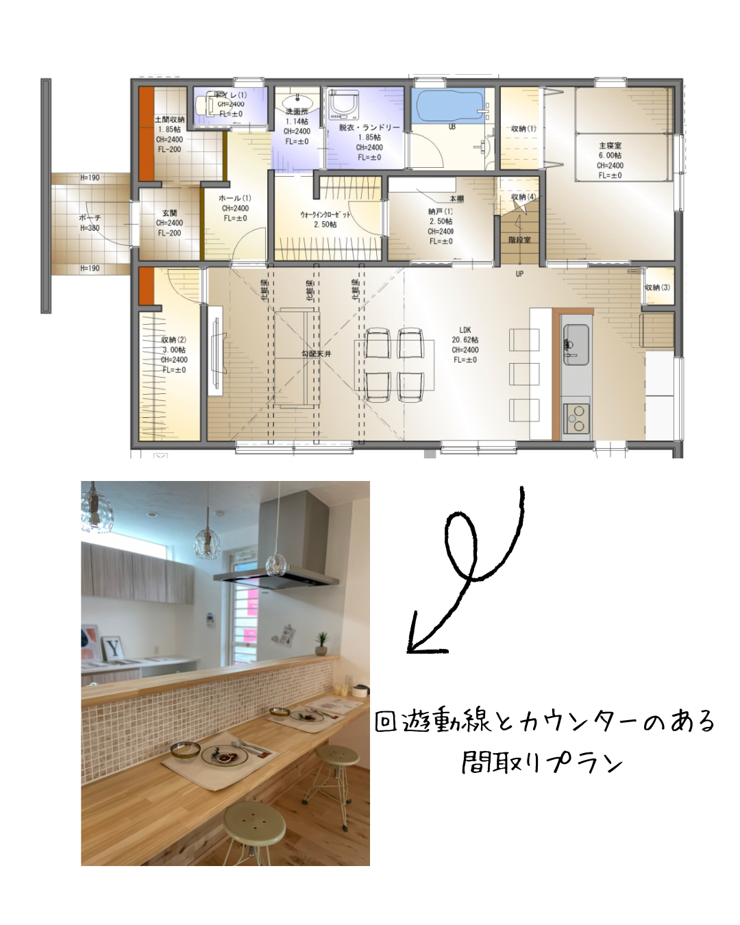 ポイント:キッチンから洗面・ランドリーへスムーズに行ける回遊動線