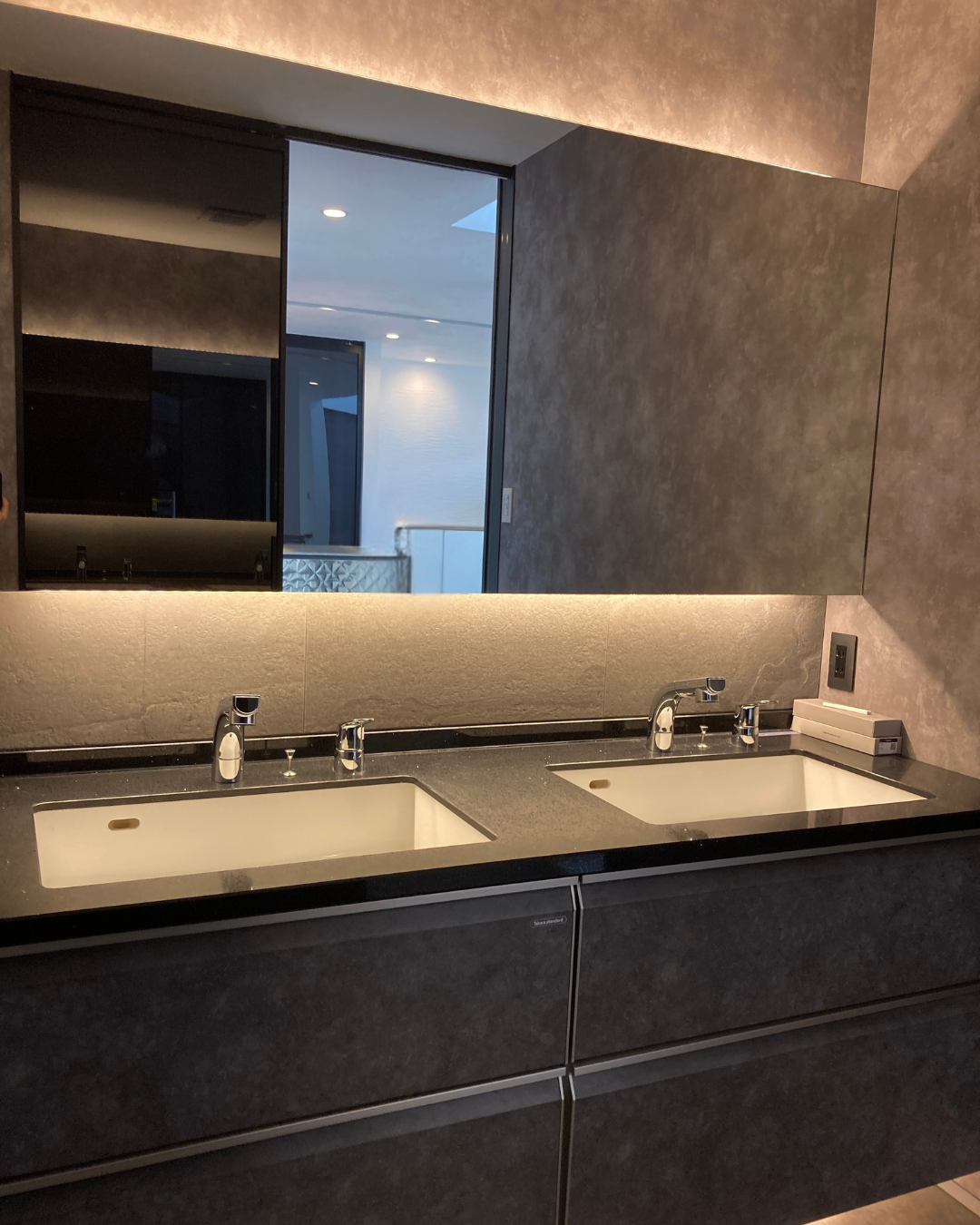 天然石、無垢材、タイル、間接照明で際立つ塗り壁など、手触りや質感にこだわった素材が、空間に深みと品格を与えます。