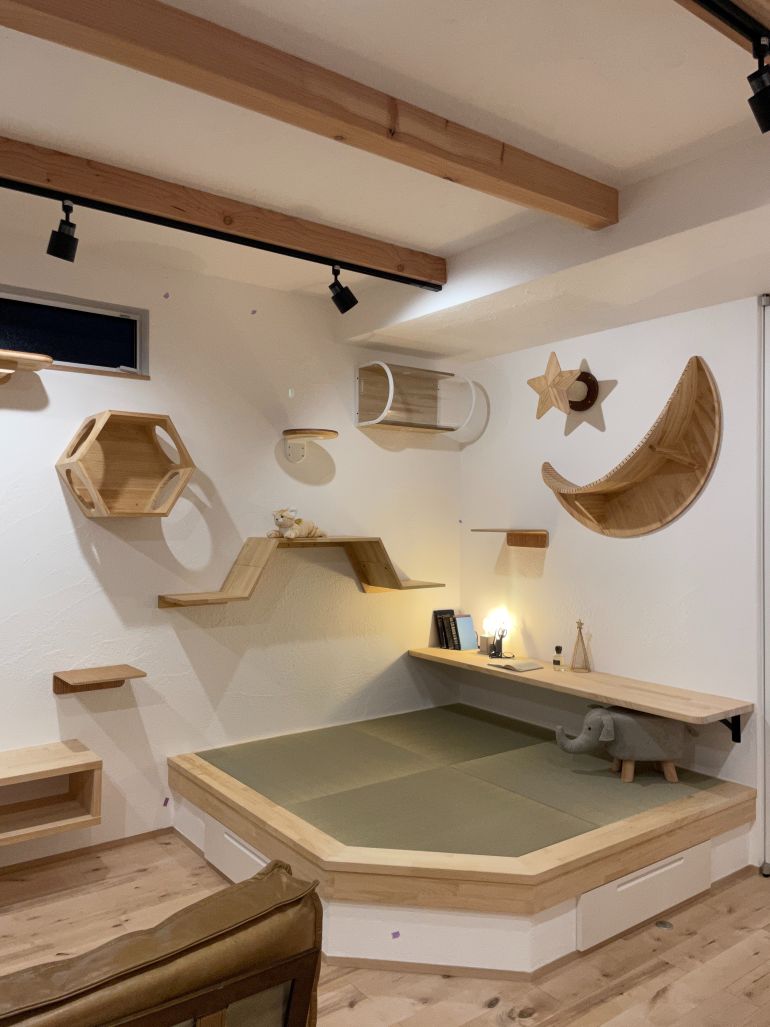 そこには造作の収納や、キャットウォークを設け、家族の気配を感じながら、遊び心のある暮らしを楽しめます。猫と暮らす方はもちろん、空間の立体的な使い方の参考にも◎